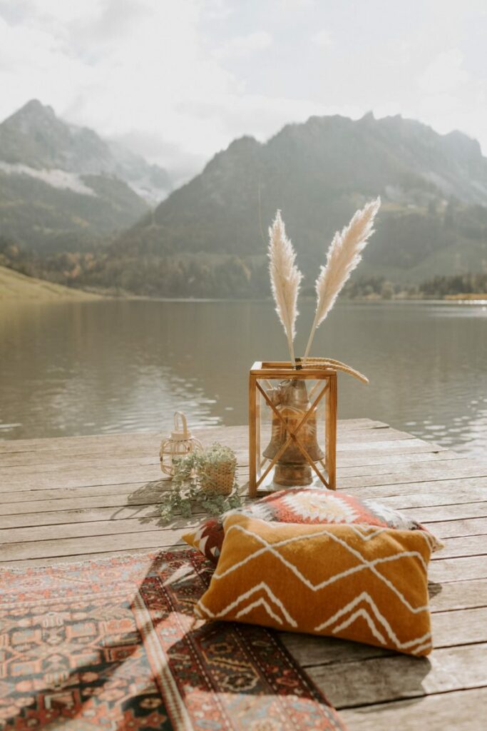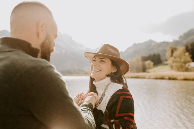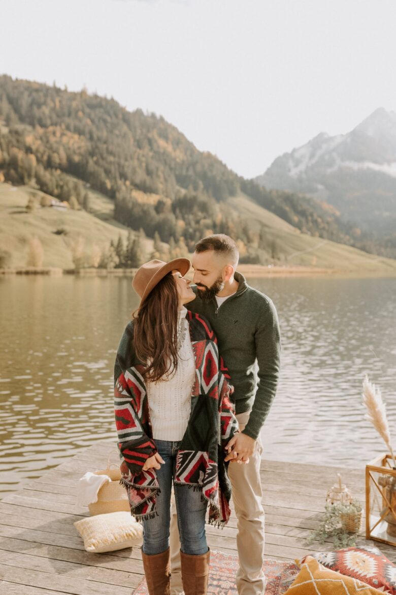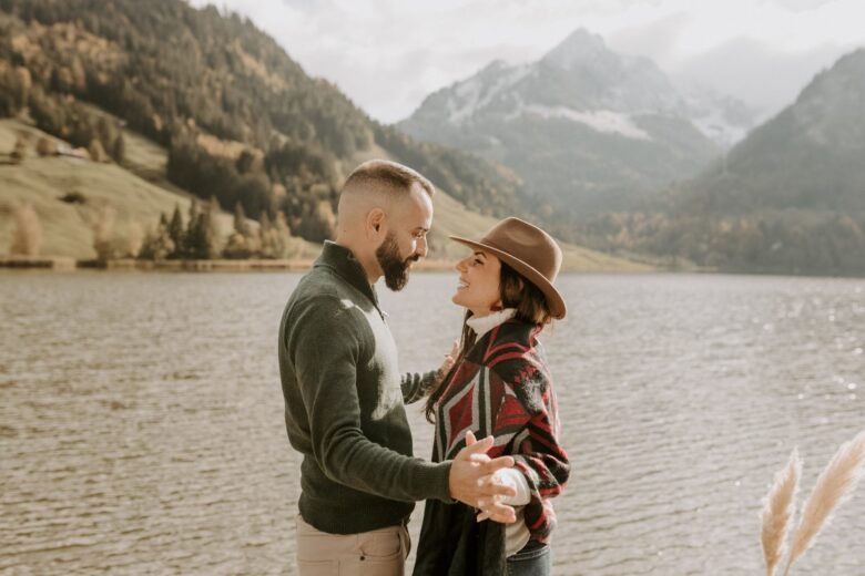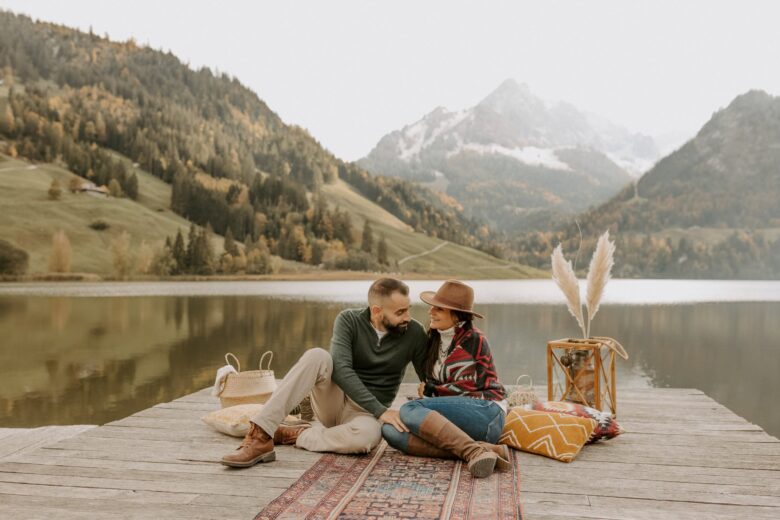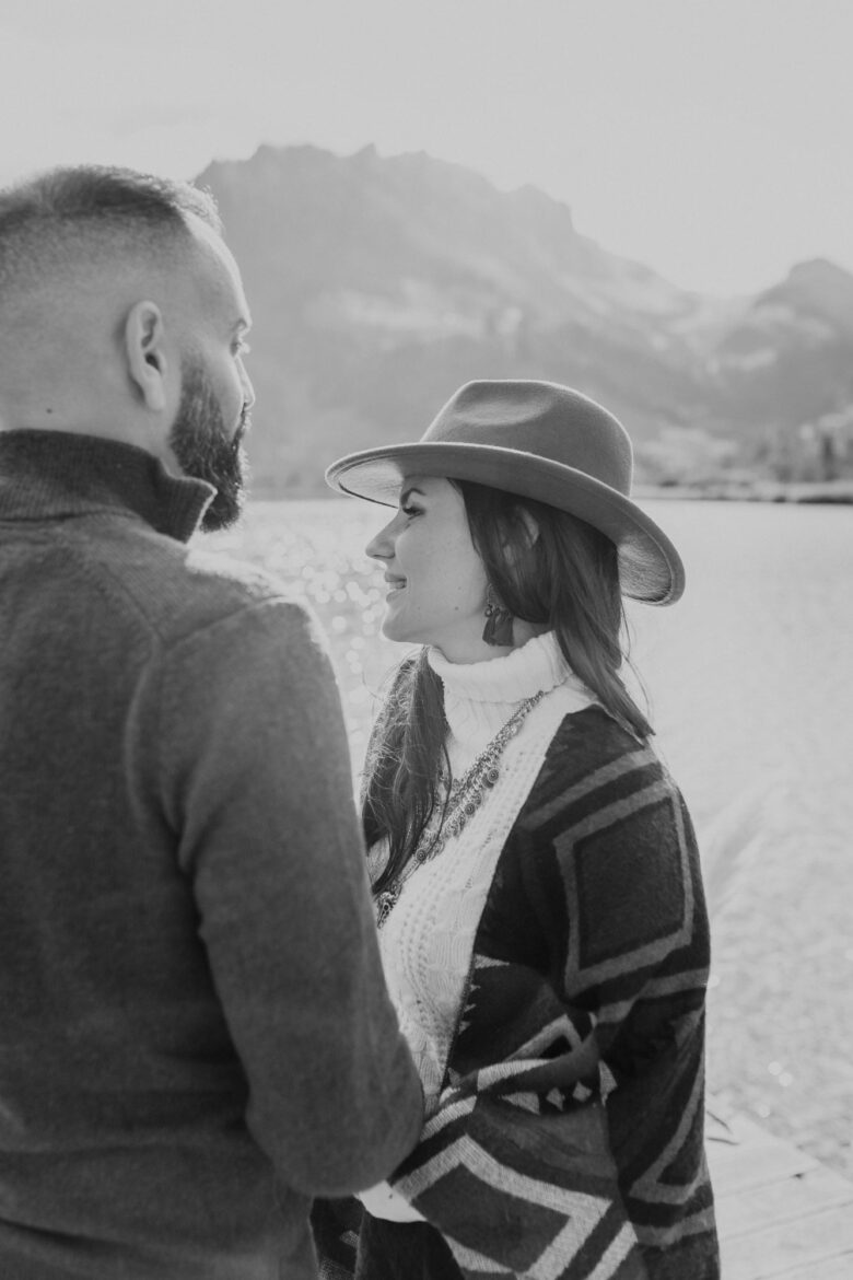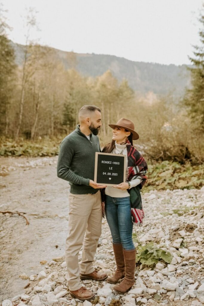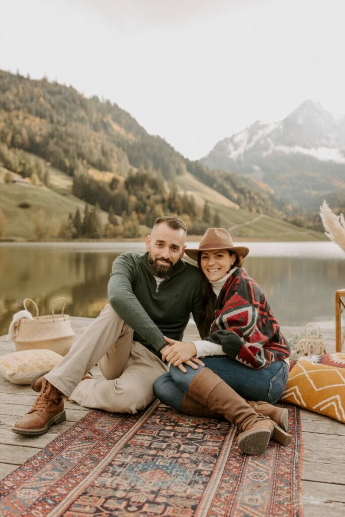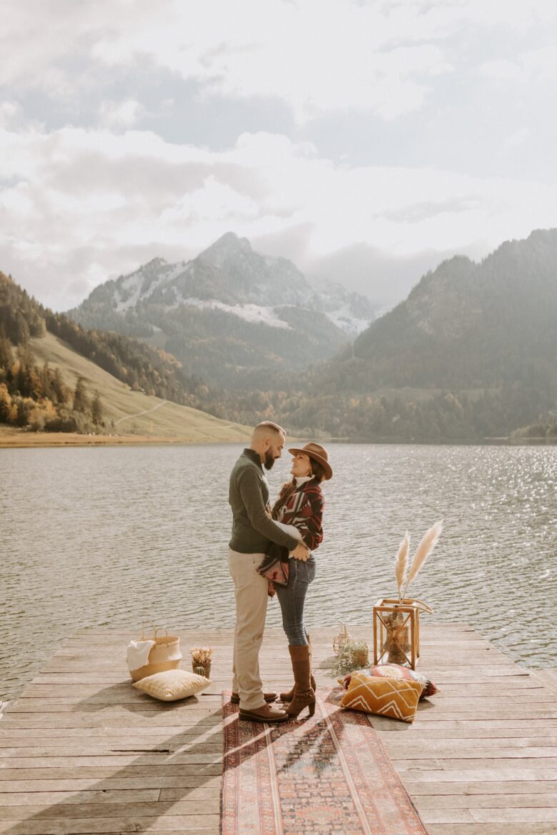 Nous avons profité de l’endroit pour se balader et varier les photos. Les premières images ont été prises au bord de l’eau, avec cette vue superbe sur les Préalpes suisses. Il y avait tellement de beaux décors, surtout que nous étions au début de l’automne et que les feuilles des arbres avaient commencé à devenir oranges et brunes, alors nous nous sommes rendus dans la forêt, non loin du lac, pour continuer la séance.